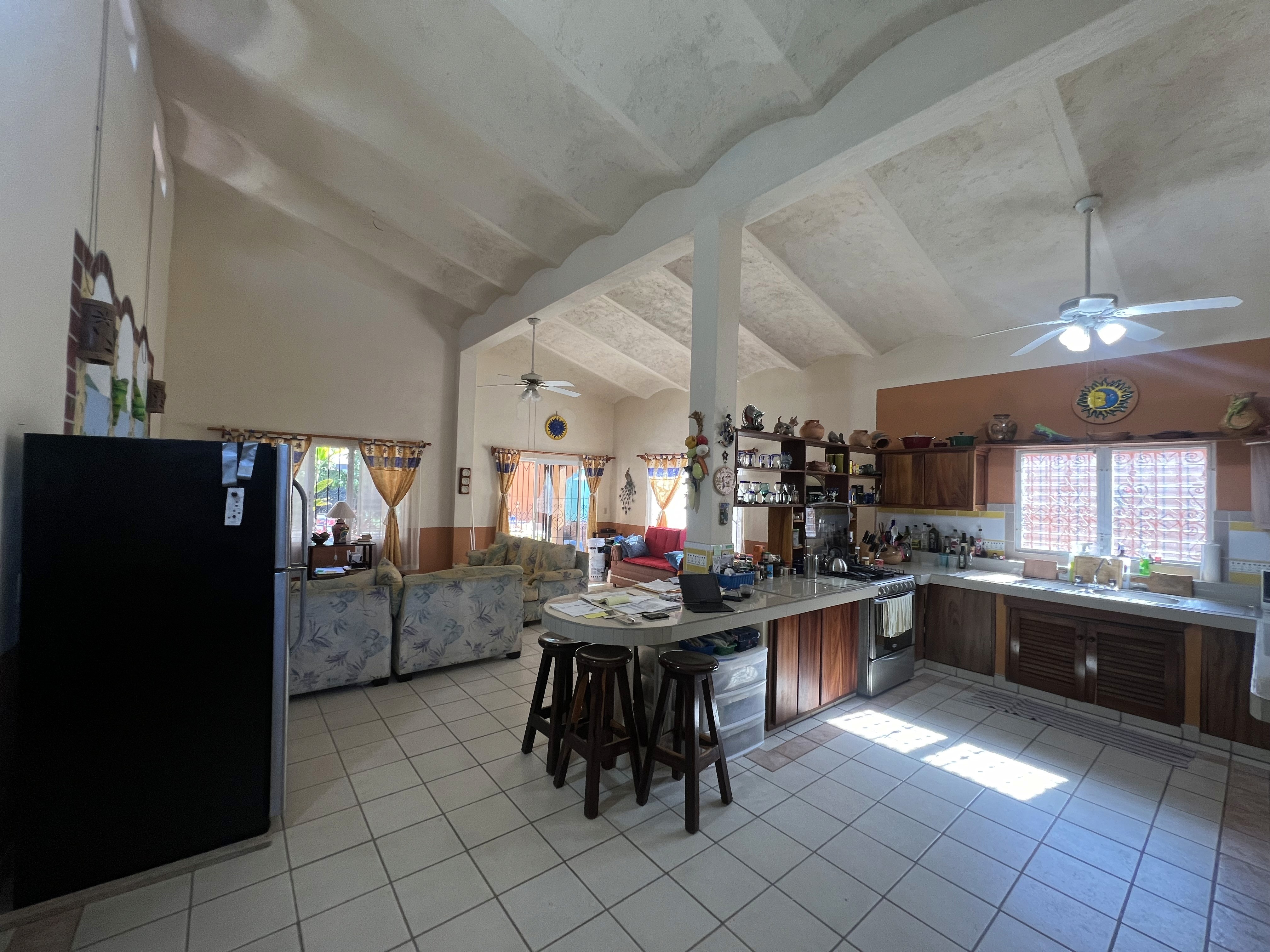 Totally open concept with 18’ sloped ceilings allows natural venting and keeps house remarkably cool in the warmest temperatures. Upgrades include new kitchen countertops and recently added Mexican Parota wood cabinets. Louvered windows, two large bedrooms, two full baths, and heavily constructed walk-in safe/storage room with dehumidifier for safe storage and protection for electronics and other valued chattels, built-in combination safe in master suite. Metal security bars cover all exterior windows and doors. Ceiling fans in all rooms. Great revenue potential on its own or in combination with two upper suites in separate addition.